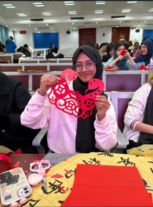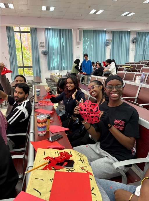 课程突破了以往纯理论讲授的模式,将文化实践作为重要延伸和补充。在老师们的精心组织下,中国学生担任文化指导员,每组负责指导一组留学生。留学生们在中国学生的耐心带领下,亲手体验毛笔书写的基本技法,感受汉字艺术的独特魅力。剪纸环节充满趣味与创意。留学生们学习剪纸的基本技巧,并成功剪出“春”字、窗花等传统纹样。这种"小组指导"模式让留学生获得了沉浸式的文化体验,也为中国学生创造了宝贵的英语交流实践机会。