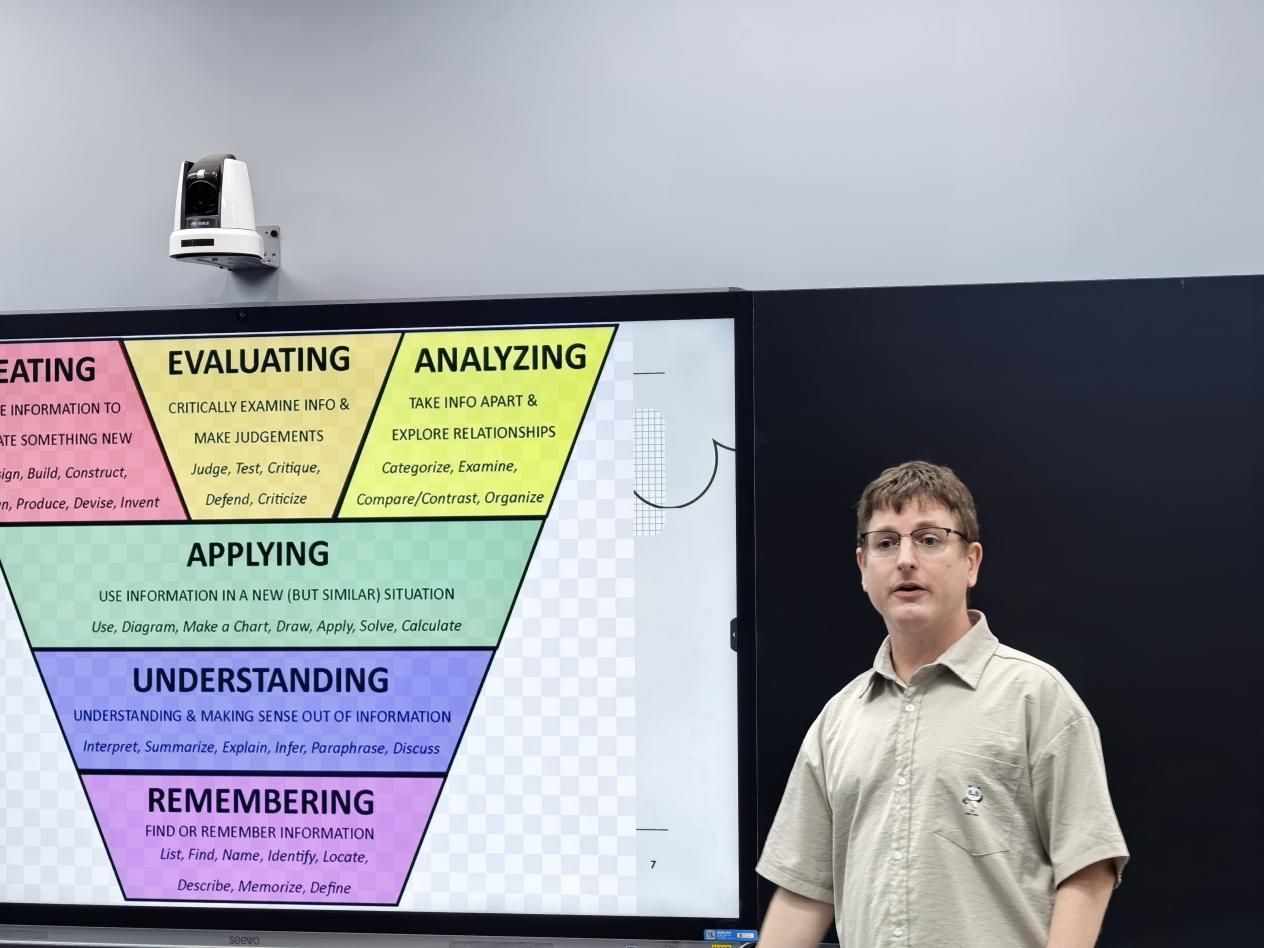 活动伊始,外教Nicholas围绕“Types of questions and cognitive levels”(问题类型与认知水平)开展专题讲座。他结合布鲁姆认知层级理论和自身教学经验,深入剖析了七大问题类型与学生不同认知层级水平的匹配要求。讲座中,Nicholas认为,课堂提问的设计需要分层,既要有Lower-order questions以检测学生的记忆和理解,也要有Higher-order questions去鼓励学生分析、评价和创造。同时,他还分享了课堂教学中善用提问的实用技巧,包括提前准备问题、善用利用学生思考问题时的等待时间、问题分配要公平公正、巧用后续提问鼓励学生深入思考、引导学生主动提问等等,为在场教师提供了可直接应用于教学实践的方法。